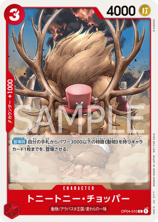カード「トニートニー・チョッパー(OP04-010)」は、「スタンダードバトルパックVol.8」に収録された赤属性のキャラクターカードで、コストは3、パワーは4000です。特徴は「動物」「アラバスタ王国」「麦わらの一味」で、登場時に手札から「動物」特徴を持つパワー3000以下のキャラを1枚場に出すことができます。この効果を活かして、動物系キャラをサポートする役割を果たし、デッキの柔軟性を高めます。