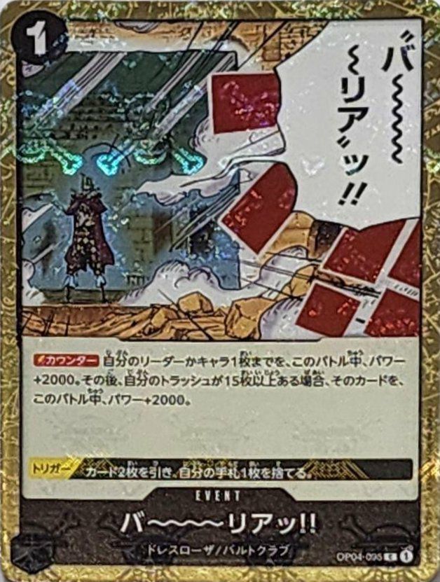 他の画像を見る 販売価格 ¥ 75 〜 ¥ 120 税込 販売価格 ¥ 税込 状態A 状態B 状態C 状態D バーーーーリアッ!!(OP04-095)[C-P](フルアートパラレル) 商品詳細を見る お気に入りに登録する