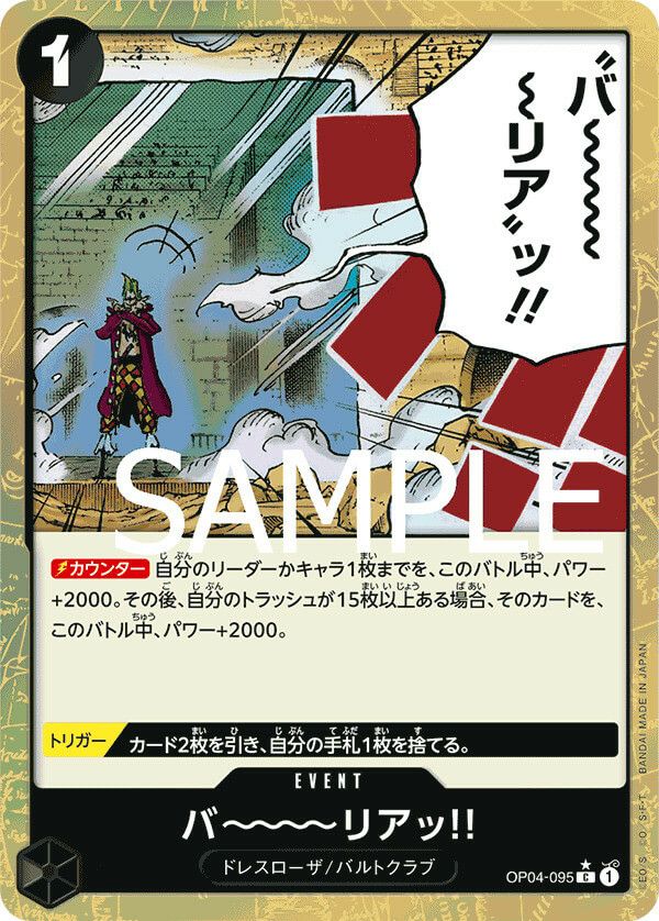 「バーーーーリアッ!!」は「ワンピースカードゲーム」のフルアートパラレル仕様のカードで、強力な攻撃力を誇るコストの低いキャラクター「バーソロミュー・くま」の個性を表現した一枚です。特にこのカードは、フルアート仕様で迫力満点なビジュアルが特徴。強化されたパワーと共に、バトル中で活躍する可能性が高く、デッキに多様性を加えるための重要なカードとなっています。