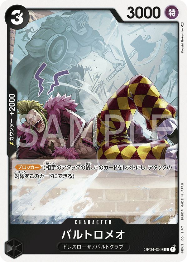 バルトロメオ(OP04-089)[R]は、コスト4の赤いキャラクターカードで、プレイヤーの手札から使える攻撃的な能力を持つカードです。バルトロメオの能力は、戦場での耐久力を高めつつ、バリアによる防御手段を提供し、強力なキャラクターや効果に対して有効に機能します。デッキにおいては、攻撃と防御を兼ね備えたバランス型として活躍します。