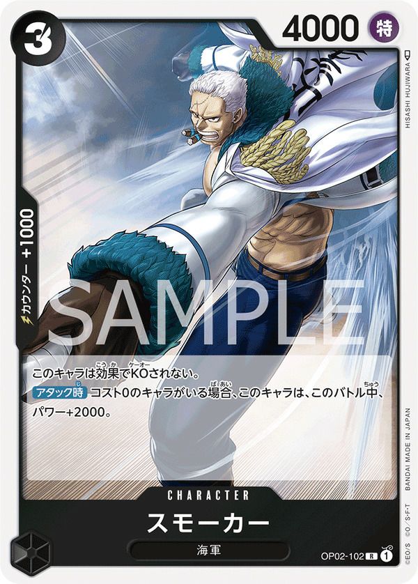 カード「スモーカー(OP02-102)[R]」は、ワンピースカードゲームの「頂上決戦」弾に登場したキャラクターカードです。コストは3、パワーは4000で、カウンターは1000。色は黒で、特徴は「海軍」です。このカードの特筆すべき能力は、効果でKOされない点です。また、アタック時にコスト0のキャラが場にいれば、このキャラはそのバトル中、パワー+2000を得るため、攻撃時の力強さが増します。デッキでの役割としては、海軍デッキやコスト管理を重視した戦術に組み込みやすいカードです。特に、低コストキャラとの連携により、アタック時の強化を活かしやすく、安定したフィールド維持とダメージの飛ばし役として活躍できます。