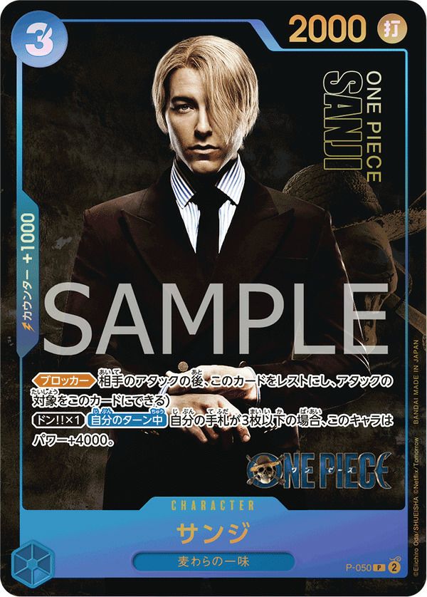 サンジ(プレミアムカードコレクション-Live Action Edition-)(P-050)[P]は、コスト3の打属性キャラクターで、パワー2000、カウンター1000。特徴「麦わらの一味」に属し、ブロッカー能力を持っています。相手のアタック後にこのカードをレストしてアタックの対象となるため、防御面で強力な役割を果たします。また、自分のターン中に手札が3枚以下なら、パワーが4000増加する効果があり、特に攻守にバランスの取れたデッキに活躍します_。