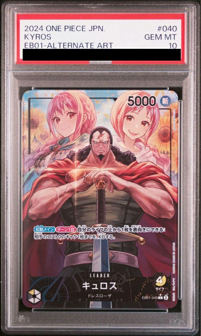 キュロス(EB01-040)は、ワンピースカードゲームのエクストラブースター「メモリアルコレクション」に収録された多色(黒/黄)のリーダーカードです。パラレル版は、イラストレーターKoushi Rokushiro氏による特別なデザインが特徴で、コレクターやプレイヤーから高い人気を集めています。