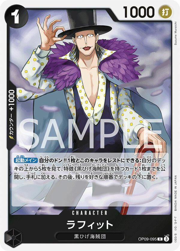 ラフィット(OP09-095)は、ワンピースカードゲーム「新たなる皇帝」セットに収録されたレアカードです。コスト1、パワー1000の打属性キャラクターで、特徴は「黒ひげ海賊団」。カードの効果としては、メインフェイズでドン!!1枚と自身をレスト状態にし、デッキの上から5枚を確認して特徴《黒ひげ海賊団》を持つカードを手札に加えるという能力を持ちます。これにより、黒ひげ海賊団デッキでのカードサーチをサポートし、デッキの安定性を高めます。