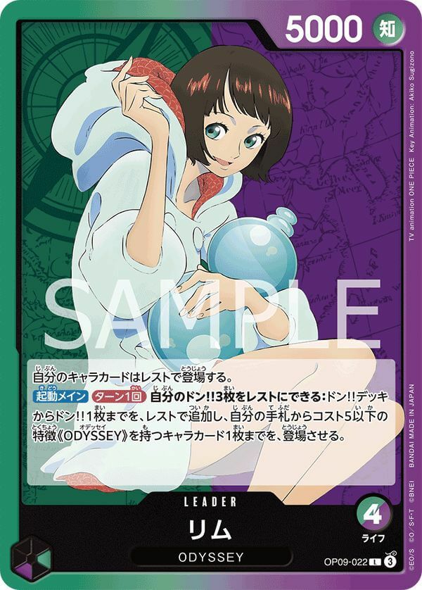 リム(OP09-022)[L]は、緑と紫の複色リーダーカードで、デッキの戦術に柔軟性を与える強力なカードです。リーダー能力で自身のコストを有利に扱うことができ、デッキ内で相手の動きを制限しつつ、リソースを最大限に活用する戦術に貢献します。パラレル版は特別なイラストが特徴で、独特のビジュアルがファンには魅力的です。