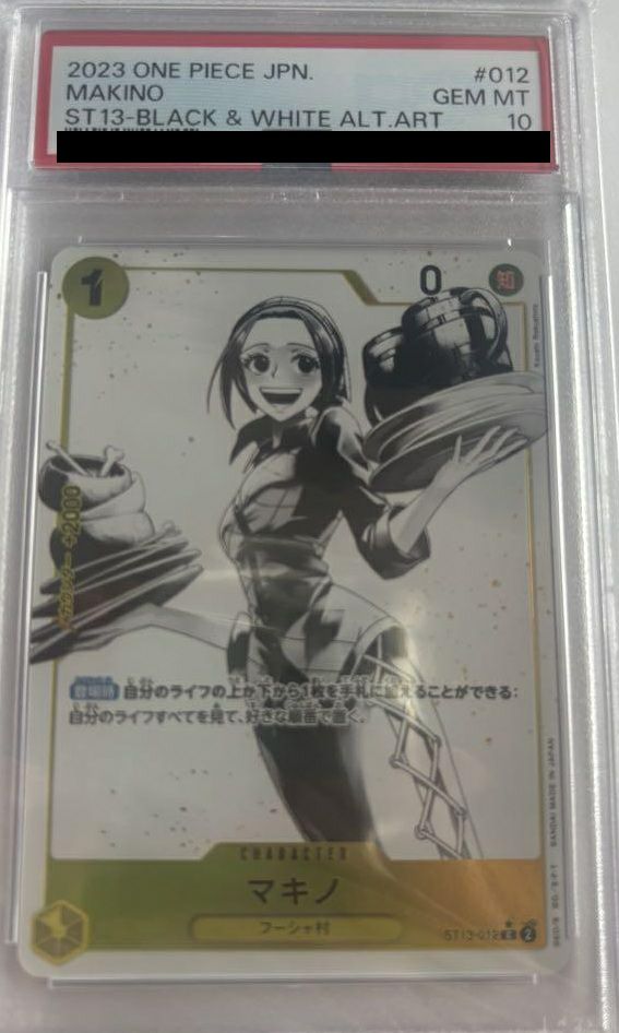 「マキノ(プレミアムカードコレクション-ベストセレクションvol.3-)(ST13-012)[C-P]」は、アニメ「ONE PIECE」に登場するマキノを描いたカードです。このカードは、プレミアムカードコレクションシリーズの一部で、特にレアリティCのシンプルなデザインが特徴です。マキノはエースやルフィと関わりが深いキャラクターで、カードとしてはデッキ内で支援役として使いやすく、キャラクター愛を反映させる要素が強いカードです。