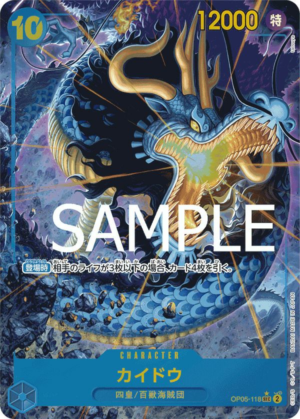「カイドウ」(OP05-118)は、青属性のキャラクターカードで、コスト10、パワー12,000を持ち、「四皇」と「百獣海賊団」の特徴を有しています。登場時にドン!!-5することで、相手のコスト6以下のキャラ1枚をKOし、さらにこのキャラをアクティブ状態にする効果を持ちます。これにより、強力な攻撃を連続で行うことが可能です。パラレル版(SEC-P)の新イラストは、カイドウが龍の姿で咆哮する迫力あるシーンが描かれており、背景には雷鳴が轟く夜空が広がっています。このデザインは、カイドウの圧倒的な力と威厳を強調しており、ファンやコレクターにとって非常に魅力的な一枚となっています。