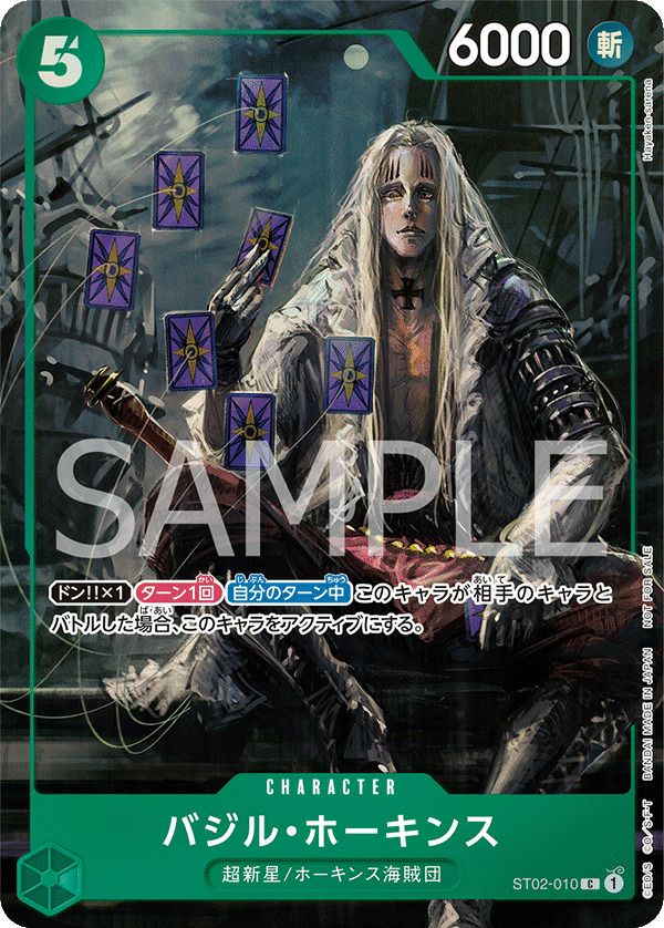 「バジル・ホーキンス(プロモーションパックEX Vol.1)」(ST02-010)は、緑属性のキャラクターカードで、コスト5、パワー6000を持ちます。特徴は「超新星」と「ホーキンス海賊団」です。このカードは、2023年5月から開催された「チャンピオンシップ2024 WAVE1 マッチングバトル」で3勝した際の記念品として配布されました。デッキでは、コスト5でパワー6000のキャラクターとして、中盤以降の戦力として活躍が期待できます。また、プロモーションパックEX Vol.1に収録された限定カードであり、特別なイラストが施されているため、コレクターズアイテムとしての価値も高いです。