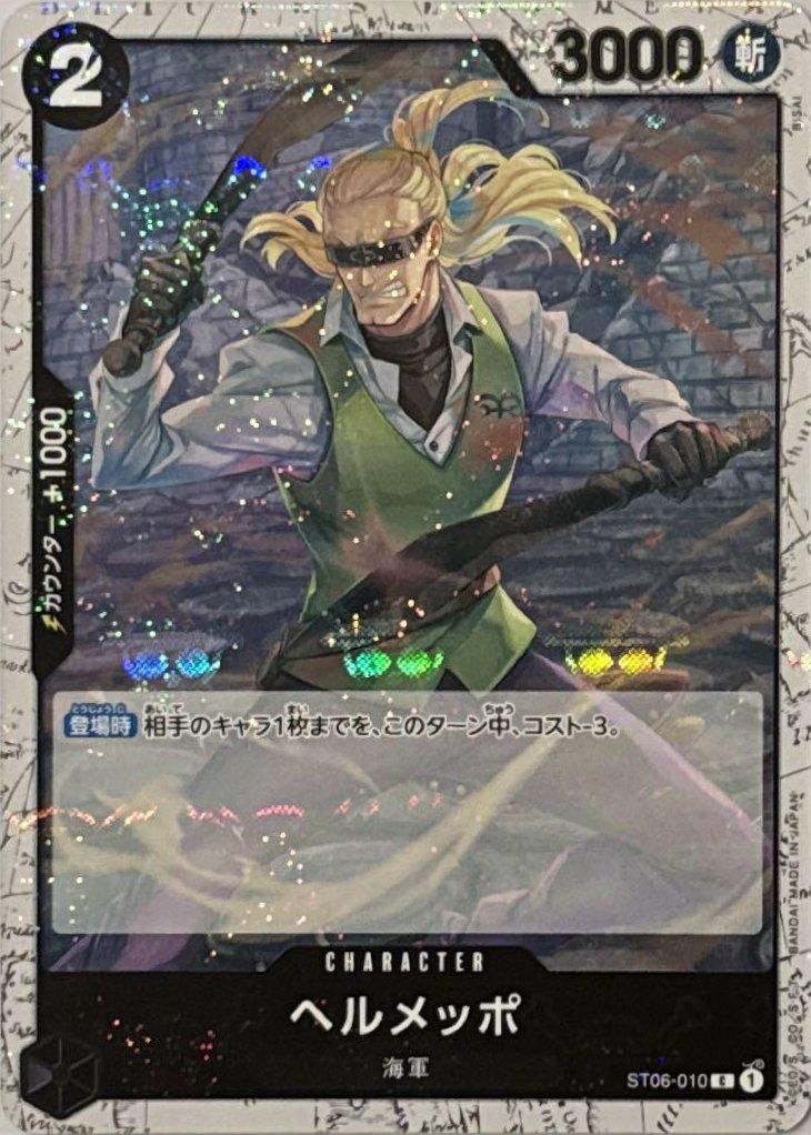 ヘルメッポ(海賊旗フォイル)(ST06-010)[C]は、黒属性のキャラクターカードで、コスト2、パワー3000、カウンター1000です。能力「登場時」では、相手のキャラクター1枚をターン中にコスト-3する効果を持ち、相手のプレイを妨害します。海賊旗フォイル仕様により、カードに特別な光沢が施されており、視覚的にも魅力的です。