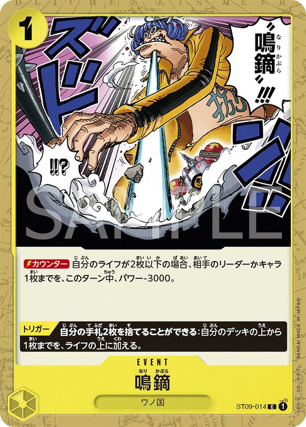 「鳴鏑(ST09-014)」は、ワノ国編のイベントカードで、コスト1の黄色のカードです。自分のライフが2枚以下の場合、相手のリーダーまたはキャラ1体のパワーを-3000するカウンター能力を持ち、状況を有利に進めるために有効です。また、トリガー効果で手札2枚を捨て、デッキトップから1枚をライフに加えることでリカバリーやカード補充が可能となります。