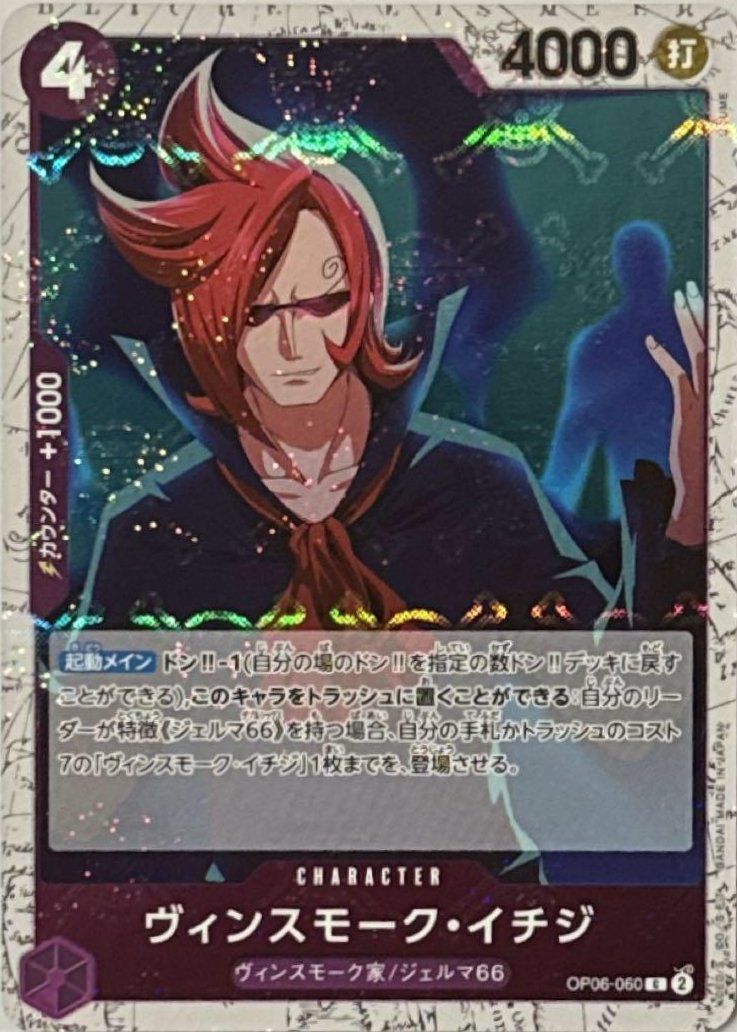 「ヴィンスモーク・イチジ(OP06-060)[C]」は、紫属性のキャラクターカードで、コスト3、パワー3000です。能力は「ジェルマ66」の特徴を活かす効果があり、手札やトラッシュのコスト7の「イチジ」を利用可能。海賊旗フォイル仕様で、ビジュアルに優れ、コレクションアイテムとしても人気です。