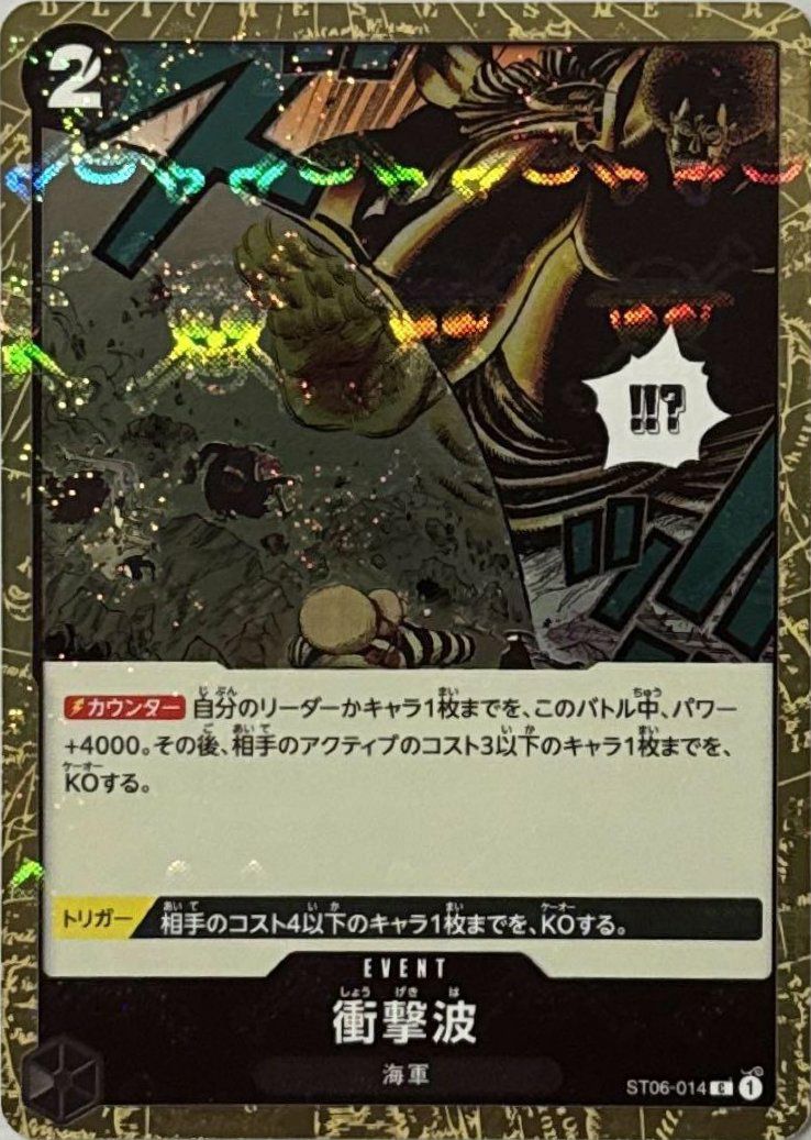 「衝撃波(海賊旗フォイル)(ST06-014)[C]」は、黒属性のイベントカードで、コスト2で使用します。カウンター能力により、リーダーやキャラクターにパワー+4000を付与した後、相手のアクティブなコスト3以下のキャラクターをKOすることができます。トリガー効果でも同様に相手のキャラをKOできるため、戦況を有利に進めるために非常に強力です。