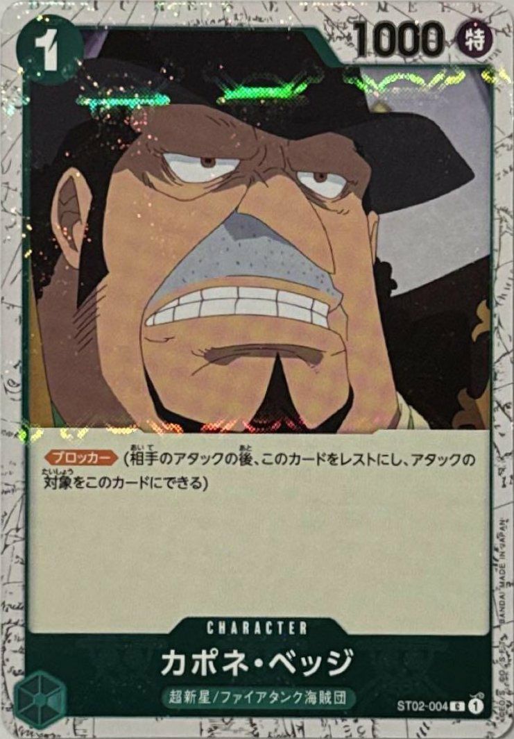 「カポネ・ベッジ」(ST02-004)は、緑属性のキャラクターカードで、コスト1、パワー1000を持ち、「超新星」と「ファイアタンク海賊団」の特徴を有しています。このカードは【ブロッカー】の能力を持ち、相手の攻撃を引き受けることで、デッキの防御力を高める役割を果たします。海賊旗フォイル仕様は、カード全体に海賊旗の模様が施された特別な加工が特徴で、コレクターやファンにとって魅力的な一枚となっています。