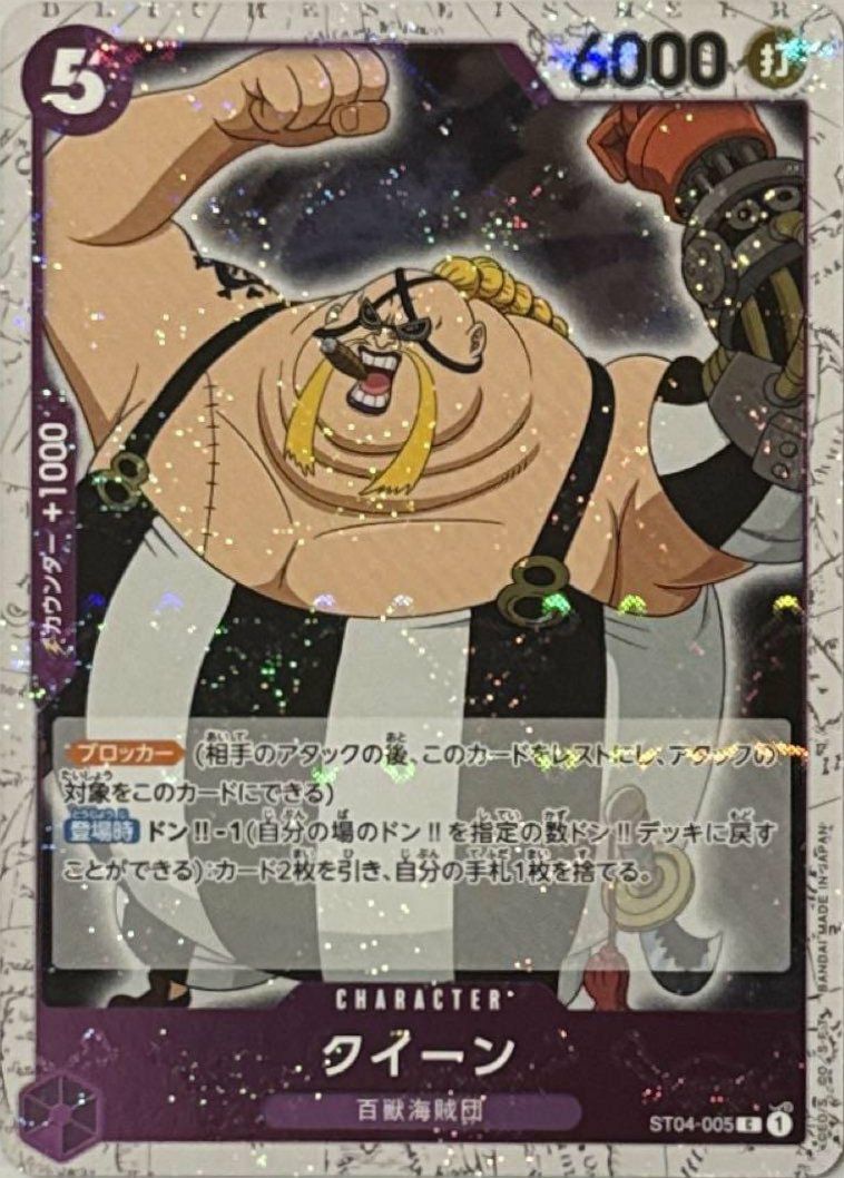 「クイーン」(ST04-005)は、紫属性のキャラクターカードで、コスト5、パワー6000を持ち、「百獣海賊団」の特徴を有しています。【ブロッカー】の能力を持ち、相手の攻撃を引き受ける防御役として活躍します。登場時にドン!!-1(自分の場のドン!!カードを1枚デッキに戻す)することで、カードを2枚引き、その後手札を1枚捨てる効果を持ち、手札の補充と調整が可能です。海賊旗フォイル仕様は、カード全体に海賊旗の模様が施された特別な加工が特徴で、コレクターやファンにとって魅力的な一枚となっています。