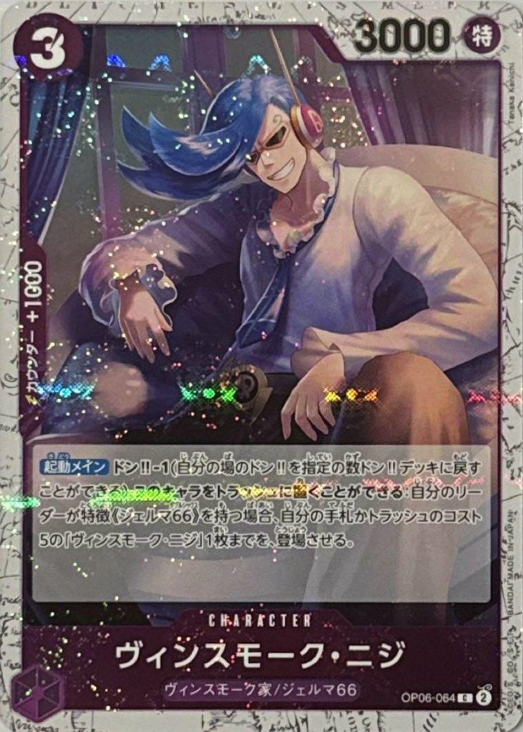 「ヴィンスモーク・ニジ(OP06-064)」は、ジェルマ66の一員であるヴィンスモーク家のキャラクターカードです。コスト3で3000パワーの紫属性カード。特徴的な能力「起動メイン」で、ドンを戻し、自身をトラッシュに置くことで手札やトラッシュからコスト5の「ヴィンスモーク・ニジ」を場に出すことができます。このカードは特に「ジェルマ66」デッキで活躍しやすく、リーダーとのシナジーを活かすデッキ構築において重要な役割を果たします。また、海賊旗フォイル版は美麗なホイル加工が施されており、コレクション性も高いカードです。