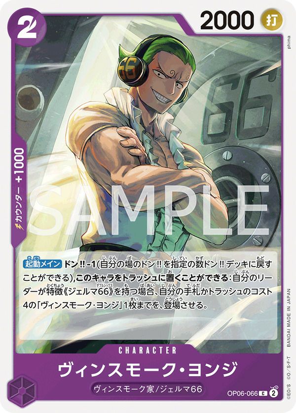 ヴィンスモーク・ヨンジ(OP06-066)は「ジェルマ66」の一員として登場するキャラクターカードです。紫色のコスト2、パワー2000の「ストライク」能力を持ち、手札やトラッシュからコスト4のヨンジを登場させることができる能力も特徴です。さらに+1000のカウンターを持つため、耐久力も高く、フィールドでの活躍が期待できます。カードのレアリティはCで、海賊旗フォイルバージョンも存在しています。