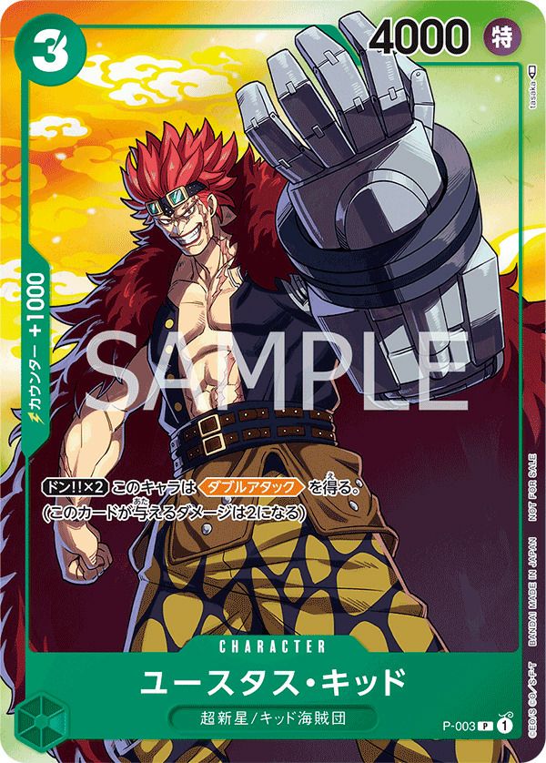 「ユースタス・キッド(セブンイレブンタイアップキャンペーン オリジナルカード)」(P-003)は、緑属性のプロモーションカードで、コスト3、パワー4000を持ちます。ドン!!カードを2枚付与することでダブルアタックを得て、1回の攻撃で2点のダメージを与えることが可能です。このカードはセブン‐イレブンのタイアップキャンペーンで配布された限定品で、特別なイラストが施されています。デッキでは高い攻撃力を発揮し、コレクターズアイテムとしても人気があります。