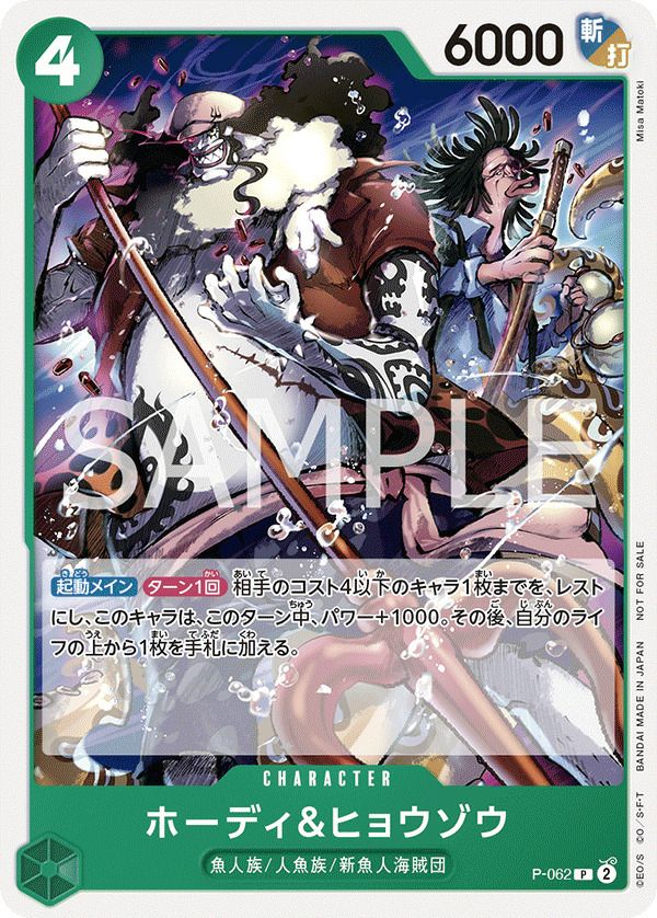 「ホーディ&ヒョウゾウ(交流会2023年12月開催記念品)」(P-062)は、緑属性のキャラクターカードで、コスト4、パワー6000を持ちます。特徴は「魚人族」「人魚族」「新魚人海賊団」です。起動メイン効果として、ターン1回、相手のコスト4以下のキャラ1枚をレストにし、このキャラのパワーをそのターン中+1000します。その後、自分のライフの上から1枚を手札に加えることができます。このカードは、2023年12月1日以降に開催された交流会の参加記念品として配布されました。デッキでは、相手キャラの行動を制限しつつ、自身のパワーを強化し、ライフを手札に加えることで手札補充も可能な多機能なカードとして活躍します。また、プロモーション限定のカードであるため、コレクターズアイテムとしても価値があります。