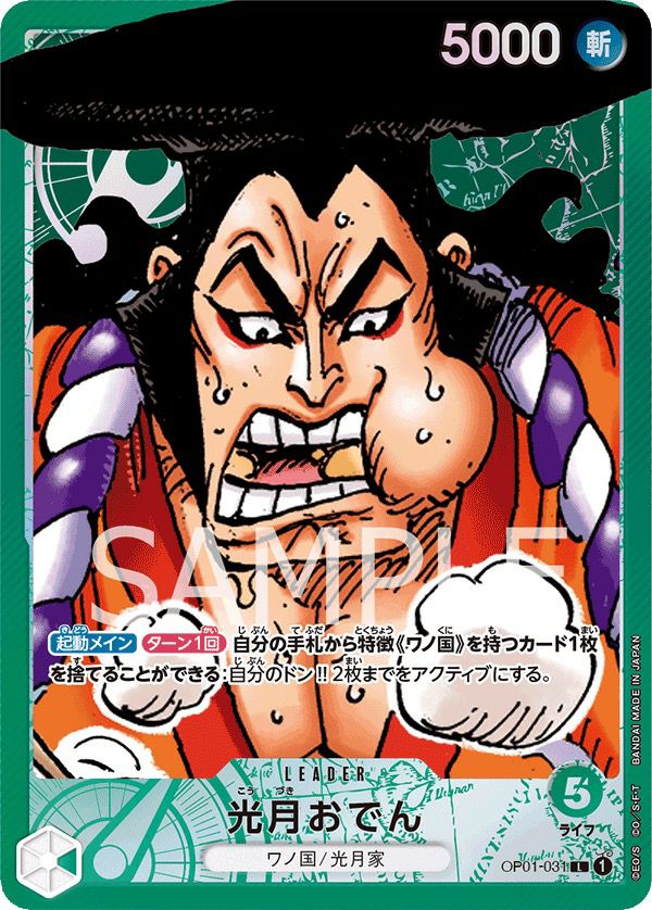 光月おでん(OP01-031)は、ワンピースカードゲーム第1弾「ROMANCE DAWN」に収録された緑属性のリーダーパラレル(L-P)カードです。このカードは、通常版とは異なる特別なイラストが特徴で、コレクターやプレイヤーから高い人気を集めています。リーダー効果として、ターン1回、自分の手札から特徴《ワノ国》を持つカード1枚を捨てることで、自分のドン!!カード2枚までをアクティブにすることができます。