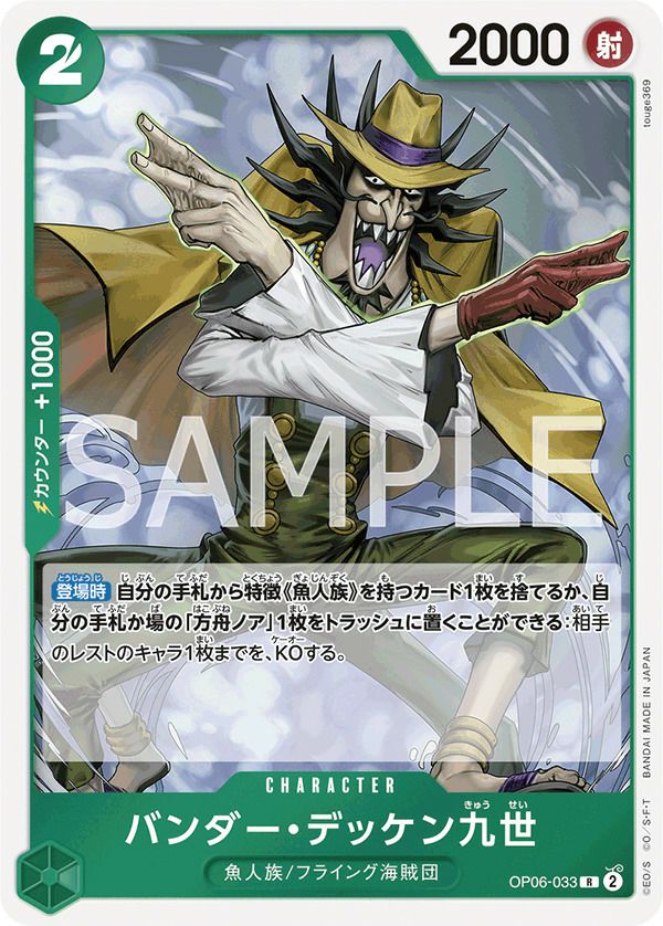 バンダー・デッケン九世(OP06-033)は、ワンピースカードゲームのブースターパック「双璧の覇者」(OP-06)に収録されたレア(R)カードです。緑属性のキャラクターで、コスト2、パワー2000、カウンター1000を持ち、特徴は魚人族とフライング海賊団です。登場時に、手札から特徴「魚人族」を持つカード1枚を捨てるか、手札または場の「方舟ノア」1枚をトラッシュに置くことで、相手のレスト状態のキャラ1枚をKOする効果を持ちます。