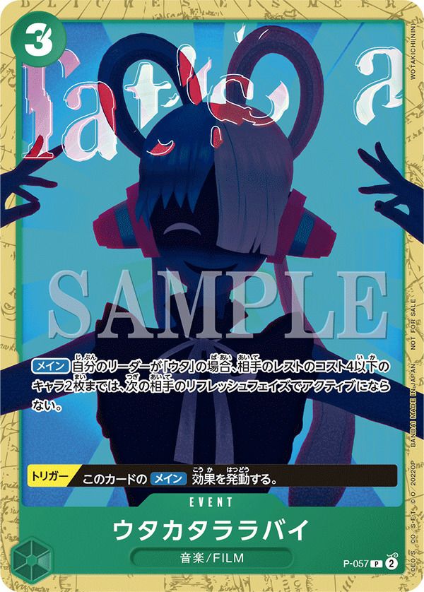 「風のゆくえ」(P-058)は、緑属性のイベントカードで、コスト2を持ちます。特徴は「音楽」と「FILM」です。メイン効果として、自分のリーダーが「ウタ」の場合、このターン終了時に自分の特徴「FILM」を持つキャラすべてをアクティブにすることができます。また、トリガー効果としても同様に、自分の特徴「FILM」を持つキャラすべてをアクティブにします。このカードは、2023年11月3日から始まった映画『ONE PIECE FILM RED』のアンコール上映時の入場者プレゼント「ONE PIECEカードゲーム アンコールパック」に収録されています。 デッキでは、「ウタ」をリーダーとし、「FILM」属性のキャラを多く採用することで、攻撃後に再度アクティブにして防御や追加攻撃に備える戦術が可能となります。特別なイラストが施されており、コレクターズアイテムとしても高い価値があります。