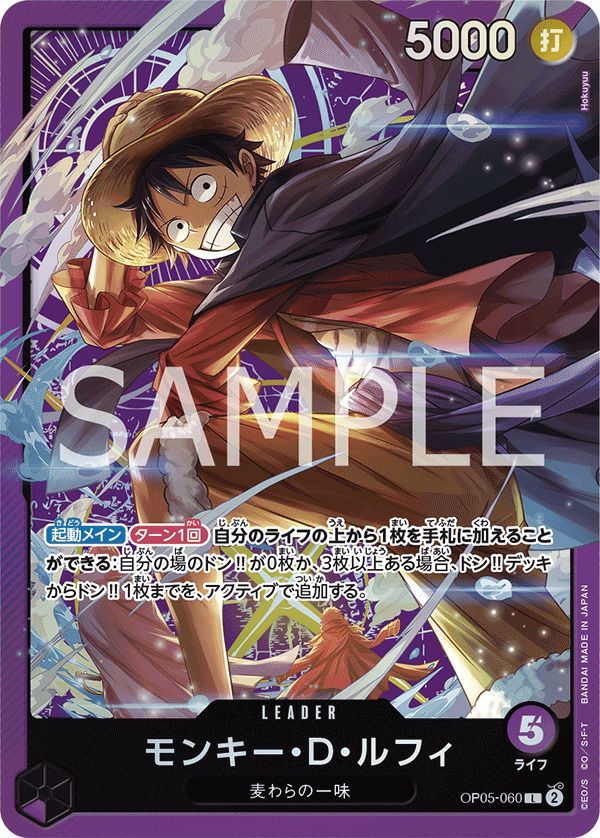 モンキー・D・ルフィ(ONE PIECEカードゲーム SOUND LOADER Volume.1 特典カード)(OP05-060)[L]は、カードゲームの体験を一層盛り上げるアイテムです。SOUND LOADERの特典カードとして登場し、ルフィを描いた新規イラストが特徴。カード自体はゲームプレイ中に「We Are」のテーマ曲やキャラクターのセリフなど、アニメの音声効果を楽しめる専用ローダーとともに提供されます。
