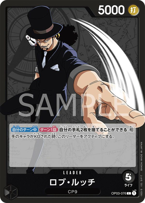 ロブ・ルッチ(OP03-076)は、ワンピースカードゲーム「強大な敵」ブースターパックに収録された黒属性のリーダーカードです。アタック時にドン!!カードを2枚レストすることで、相手のコスト2以下のキャラ1体をKOする効果を持ちます。この能力により、相手の小型キャラを除去し、戦況を有利に進めることが可能です。