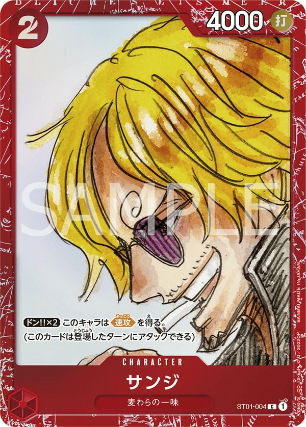 サンジ(プレミアムカードコレクション ‐ONE PIECE FILM RED ‐)(ST01-004)は、赤色のコスト3キャラクターで、速攻能力を持つため、登場したターンに即座に攻撃が可能です。麦わらの一味の一員として、デッキの早期攻撃力を高め、相手にプレッシャーを与えます。このカードは「プレミアムカードコレクション ‐ONE PIECE FILM RED ‐」に収録されています。