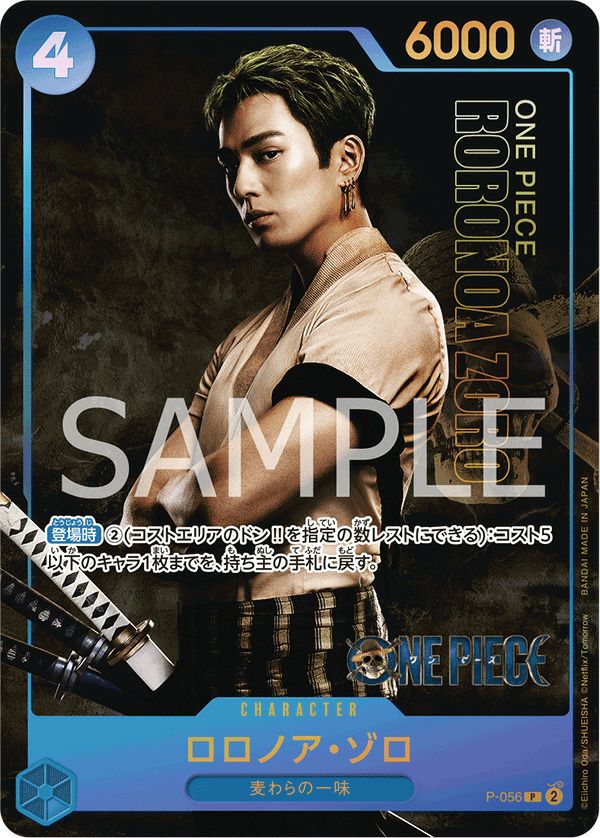 ロロノア・ゾロ(プレミアムカードコレクション-Live Action Edition-)(P-056)は、青属性のキャラクターカードで、コスト4、パワー6000を誇ります。登場時にコスト5以下のキャラクターを手札に戻す能力を持ち、相手の戦力を削ることができます。麦わらの一味の一員として、デッキでは戦闘面で活躍し、強力なコントロール役を担います。