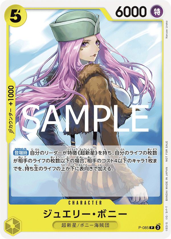 「ジュエリー・ボニー(交流会2024年11月開催記念品)」(P-085)は、黄属性のキャラクターカードで、コスト5、パワー6000、カウンター+1000を持ちます。特徴は「超新星」です。登場時に、自分のリーダーが「超新星」を持ち、自分のライフが相手と同数以下であれば、相手のコスト4以下のキャラ1枚を相手のライフに加える効果を持ちます。このカードは、2024年11月に開催された交流会の参加記念品として配布されました。デッキでは、相手のキャラをライフに戻すことで盤面を制圧する戦術に活用できます。また、プロモーション限定のカードであり、特別なイラストが施されているため、コレクターズアイテムとしても高い価値があります。