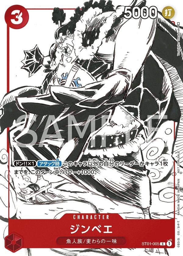 「ジンベエ(プロモーションカードセット)」(ST01-005)は、赤属性のキャラクターカードで、コスト2、パワー4000、カウンター+1000を持ちます。特徴は「魚人族」と「麦わらの一味」です。ドン!!×1の状態でアタック時、相手のコスト2以下のキャラ1枚を手札に戻す効果を持ち、相手の場をコントロールするのに有効です。このカードは、プロモーションカードセットの特典として配布されました。デッキでは、低コストで相手の小型キャラを除去するサポート役として活躍します。また、プロモーション限定のカードであり、特別なイラストが施されているため、コレクターズアイテムとしても価値があります。