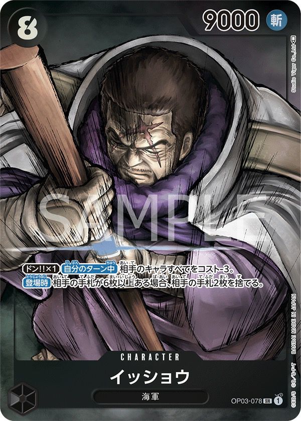 イッショウ(OP03-078)は、ワンピースカードゲーム第3弾「強大な敵」に収録された黒属性のスーパーレア(SR)キャラクターカードです。パラレル版(SR-P)は、通常版とは異なる特別なフルアートイラストが特徴で、コレクターやプレイヤーから高い人気を集めています。このカードは、コスト8、パワー9000を持ち、特徴は「海軍」です。ドン!!×1の状態で、自分のターン中、相手のキャラすべてのコストを-3する効果と、登場時に相手の手札が6枚以上ある場合、相手の手札2枚を捨てさせる効果を持ちます。