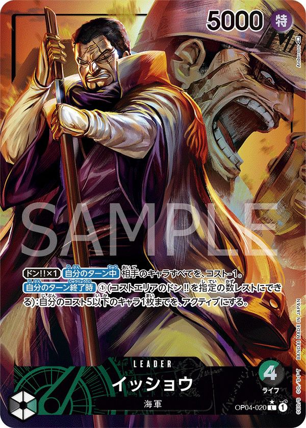 イッショウ(OP04-020)は、ワンピースカードゲーム第4弾「謀略の王国」に収録された紫属性のリーダーパラレル(L-P)カードです。このカードは、通常版とは異なる特別なフルアートイラストが特徴で、コレクターやプレイヤーから高い人気を集めています。リーダー効果として、ドン!!×1の状態でアタック時に、ドン!!-1することで、相手のコスト2以下のキャラ1枚をKOすることが可能です。さらに、相手のライフが3枚以下の場合、代わりにコスト4以下のキャラ1枚をKOすることができます。