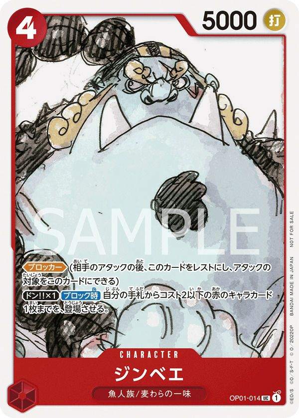 ジンベエ(『ONE PIECE FILM RED』入場者プレゼント フィナーレセット)(OP01-014)は、赤属性のユニットカードで、【ブロッカー】能力を持ち、相手のアタックを防ぐ役割を果たします。さらに、手札からコスト2以下の赤キャラクターを場に出す効果を持つため、攻防において安定したサポートを提供。フィナーレセットの一部として、映画特典カードとしても貴重な一枚です。