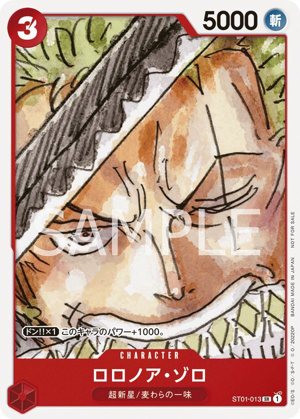 「ロロノア・ゾロ(『ONE PIECE FILM RED』入場者プレゼント フィナーレセット)」(ST01-013)は、赤属性のキャラクターカードで、コスト3、パワー5000を持ちます。特徴は「麦わらの一味」と「斬」です。このカードは、2023年1月21日から全国の劇場で配布された『ONE PIECE FILM RED』の入場者特典「フィナーレセット」に収録されています。デッキでは、コスト3でパワー5000のアタッカーとして活躍が期待できます。また、映画入場者特典として配布された限定カードであり、特別なイラストが施されているため、コレクターズアイテムとしての価値も高いです。
