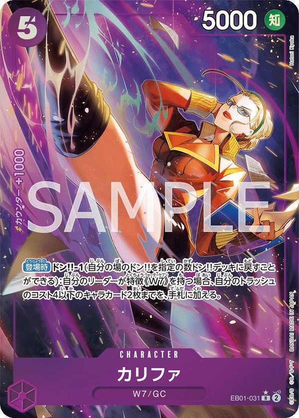 カリファ(EB01-031)は、ワンピースカードゲームのエクストラブースター「メモリアルコレクション」に収録された紫属性のレアパラレル(R-P)キャラクターカードです。コスト5、パワー5000を持ち、登場時にドン!!-1を行うことで、自分のリーダーが特徴《W7》を持つ場合、トラッシュからコスト4以下のキャラカードを2枚まで手札に加える効果を持ちます。パラレル版は、通常版とは異なる特別なイラストが特徴で、コレクターやプレイヤーから高い人気を集めています。