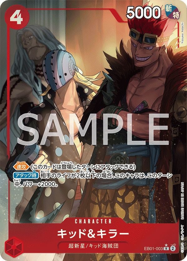 キッド&キラー(EB01-003)は、ワンピースカードゲームのエクストラブースター「メモリアルコレクション」に収録された赤属性のレアパラレル(R-P)キャラクターカードです。このカードは、通常版とは異なる特別なイラストが特徴で、コレクターやプレイヤーから高い人気を集めています。カードショップ「遊々亭」では、2,980円で販売されています。