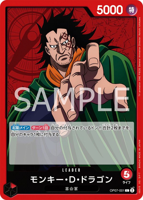 「モンキー・D・ドラゴン(OP07-001)[L]」は、ワンピースカードゲームの「500年後の未来」弾に収録されているリーダーカードです。このカードは、ドラゴンの独特なリーダー能力を活かし、ゲーム内での戦略的な役割を担います。パラレルバージョンで、色合いや質感が通常カードと異なるため、コレクターにとっては魅力的なアイテムとなっています。