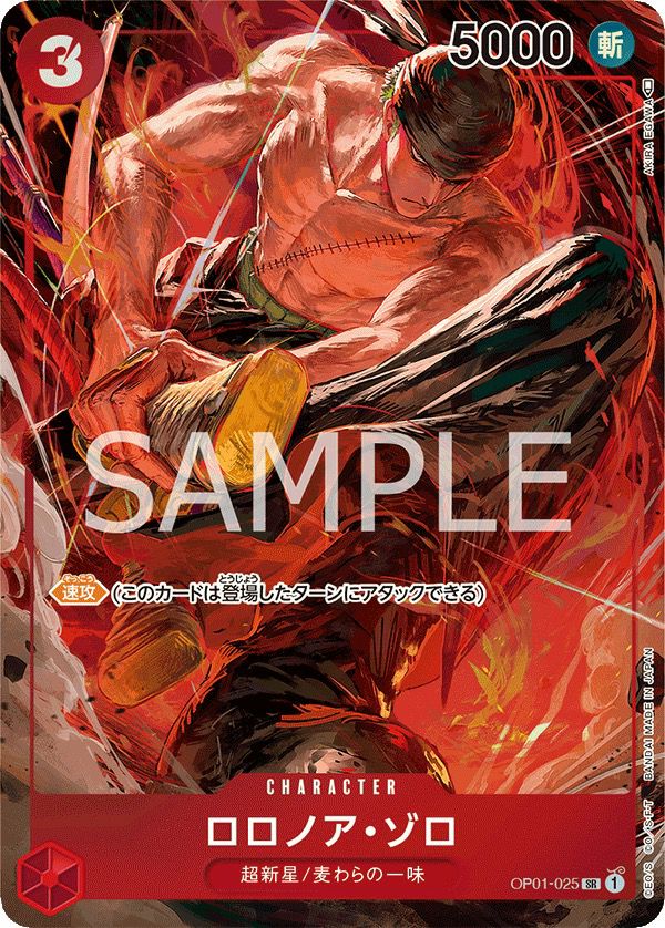ロロノア・ゾロ(OP01-025)は、ワンピースカードゲーム第1弾「ROMANCE DAWN」に収録された赤属性のスーパーレア(SR)キャラクターカードです。パラレル版(SR-P)は、通常版とは異なる特別なフルアートイラストが特徴で、コレクターやプレイヤーから高い人気を集めています。このカードは、コスト3、パワー5000を持ち、特徴は「麦わらの一味」です。効果として、ドン!!×1の状態で、このキャラはターン中、パワー+1000の能力を得ます。