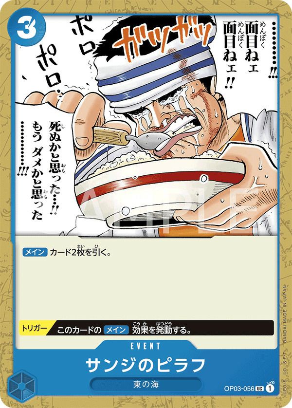 サンジのピラフ(OP03-056)[UC]は、ワンピースカードゲームの「強大な敵」ブースターに収録されたユニコモンカードです。コストは3、色は青で、特徴は「東の海」。効果としては、メインフェイズでカードを2枚引ける能力を持ち、手札を補充して次のターンに備えることができます。戦略的に手札を増やすために使うことができ、青属性デッキとの相性も良いです。