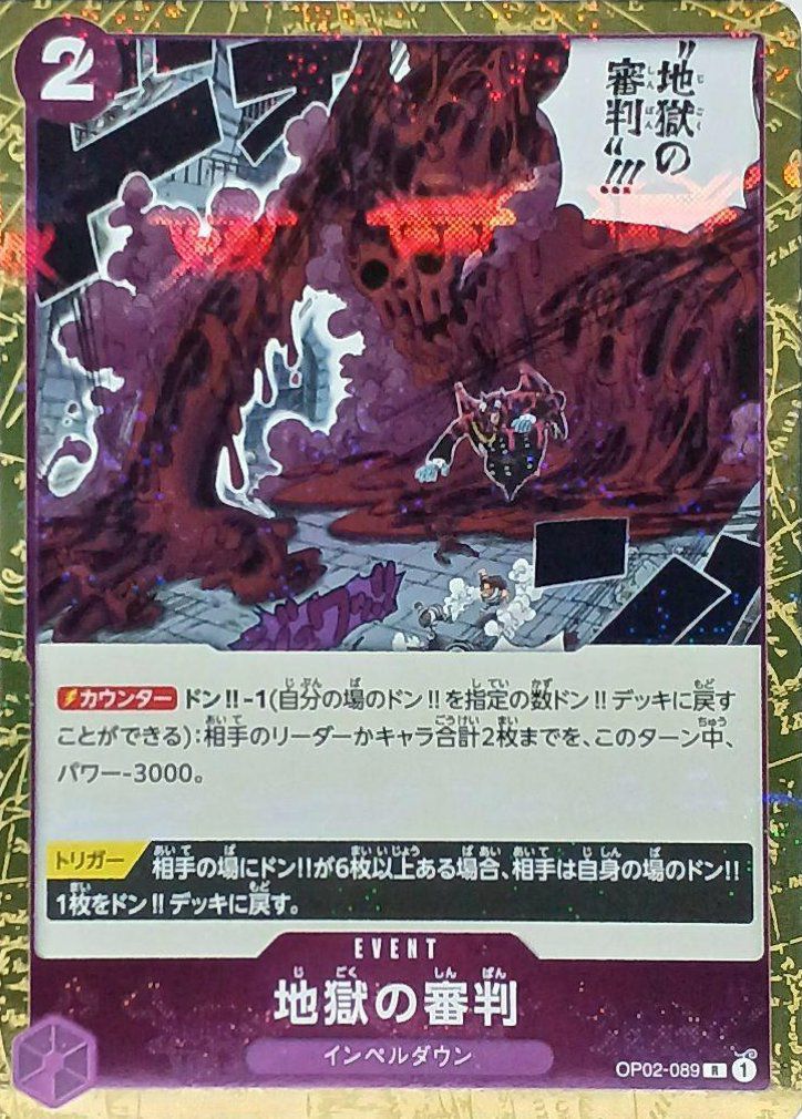 「地獄の審判(OP02-089)」は、紫属性のカードで、相手キャラクターに高い打点を与える能力を持つ。デッキの戦術においては、相手の重要なキャラクターを排除する役割を果たし、特に遅延を狙う紫デッキと相性が良い。パラレル版(海賊旗フォイル)では、カードのフレームや背景に特別な輝きが加わり、ビジュアル面でも魅力が増している。