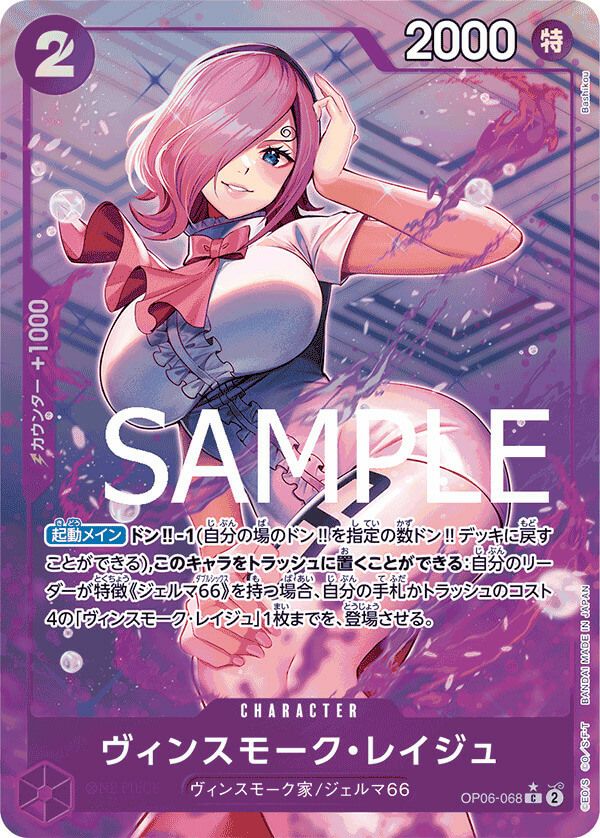 ヴィンスモーク・レイジュ(OP06-068)[C-P]は、パラレル仕様のフルアートカードで、彼女の美しいビジュアルが特徴です。このカードは、カードゲーム「ONE PIECE」で戦術的な幅を広げる補助的な役割を果たします。攻撃的な要素が少ないものの、サポートカードとして活躍しやすいデッキに組み込むことで、その効果を最大化できます。