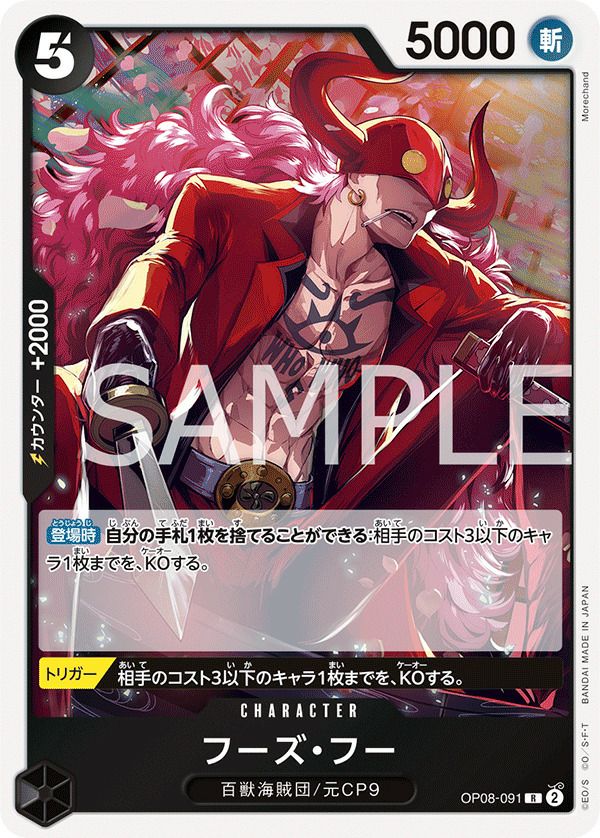 フーズ・フー(OP08-091)は、3コストで召喚できる黒色のキャラクターカード。登場時に相手キャラをコスト以下の攻撃力で破壊する能力を持ち、デッキの除去役として活躍します。元王族の血筋を持つ彼の力強い能力は、相手の重要なカードを除去して盤面を有利に進めることが可能です。