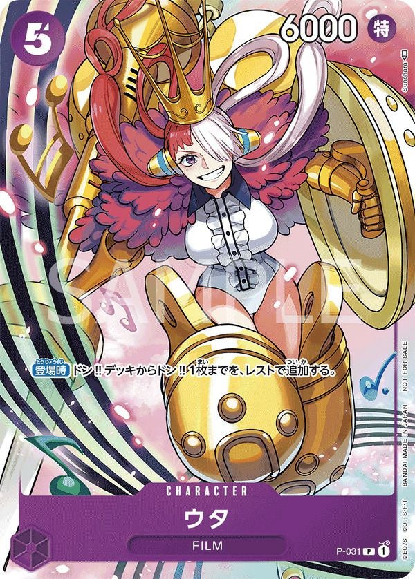 「ウタ(プロモーションパック2022 Vol.2)」(P-031)は、紫属性のキャラクターカードで、コスト3、パワー4000を持ちます。特徴は「FILM」です。登場時にドン!!デッキからドン!!カード1枚をレスト状態で追加する効果を持ち、ドン!!カードの加速に貢献します。このカードは、2022年12月から公式・公認イベントで配布された『プロモーションパック2022 Vol.2』に収録されています。デッキでは、ドン!!カードの供給源として活躍し、コレクターズアイテムとしても価値があります。