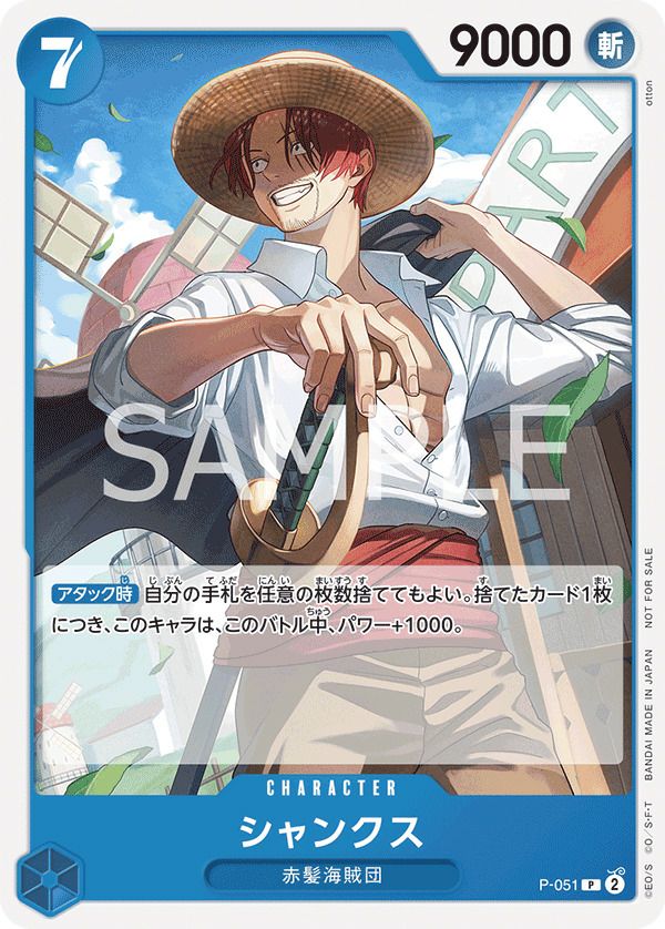 「シャンクス(プロモーションパックVol.4)」(P-051)は、青属性のキャラクターカードで、コスト7、パワー9000を持ちます。特徴は「赤髪海賊団」です。アタック時に任意の枚数の手札を捨てることで、捨てたカード1枚につき、このキャラのパワーをバトル中+1000する効果を持ち、手札を活用してパワーを強化できます。このカードは、2023年10月以降の公式・公認イベントで配布された『プロモーションパックVol.4』に収録されています。デッキでは、手札を活用した高火力アタッカーとして活躍し、コレクターズアイテムとしても価値があります。