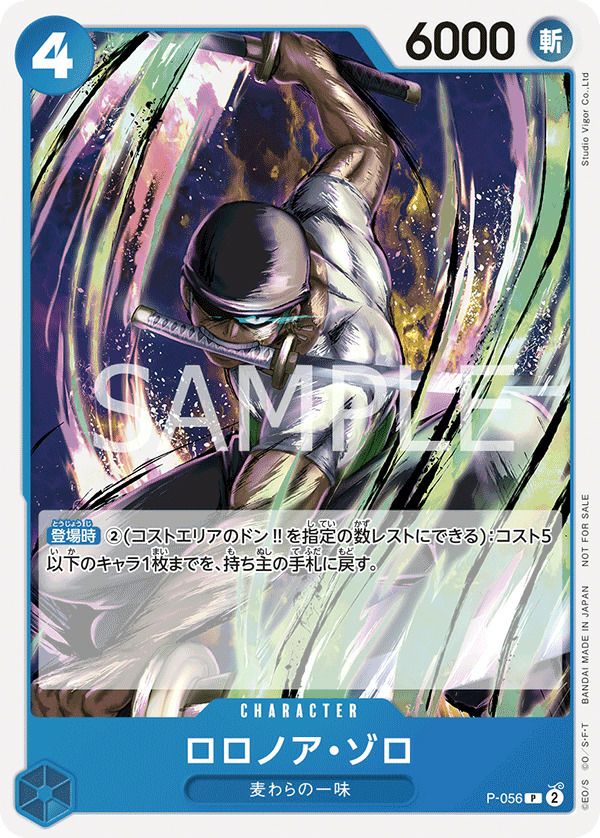 「ロロノア・ゾロ(プロモーションパックVol.4)」(P-056)は、青属性のキャラクターカードで、コスト4、パワー6000を持ちます。特徴は「麦わらの一味」です。登場時にコストエリアのドン!!カードを2枚レストすることで、相手のコスト5以下のキャラ1枚を持ち主の手札に戻す効果を持ち、相手の盤面をコントロールするのに有効です。このカードは、2023年10月以降の公式・公認イベントで配布された『プロモーションパックVol.4』に収録されています。デッキでは、相手の中型キャラを除去するサポート役として活躍し、コレクターズアイテムとしても価値があります。