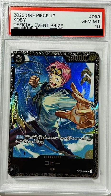 「コビー(ONE PIECEカードゲーム プロモーションパックVol.3)」(OP02-098)[R]は、コスト3でパワー4000、カウンター1000の黒属性「海軍」キャラクターです。登場時に手札1枚を捨てることで、相手のコスト3以下のキャラクターをKOできる効果を持っています。シンプルながらも強力な除去能力を有しており、黒属性デッキでの盤面制圧に役立つキャラクターです。