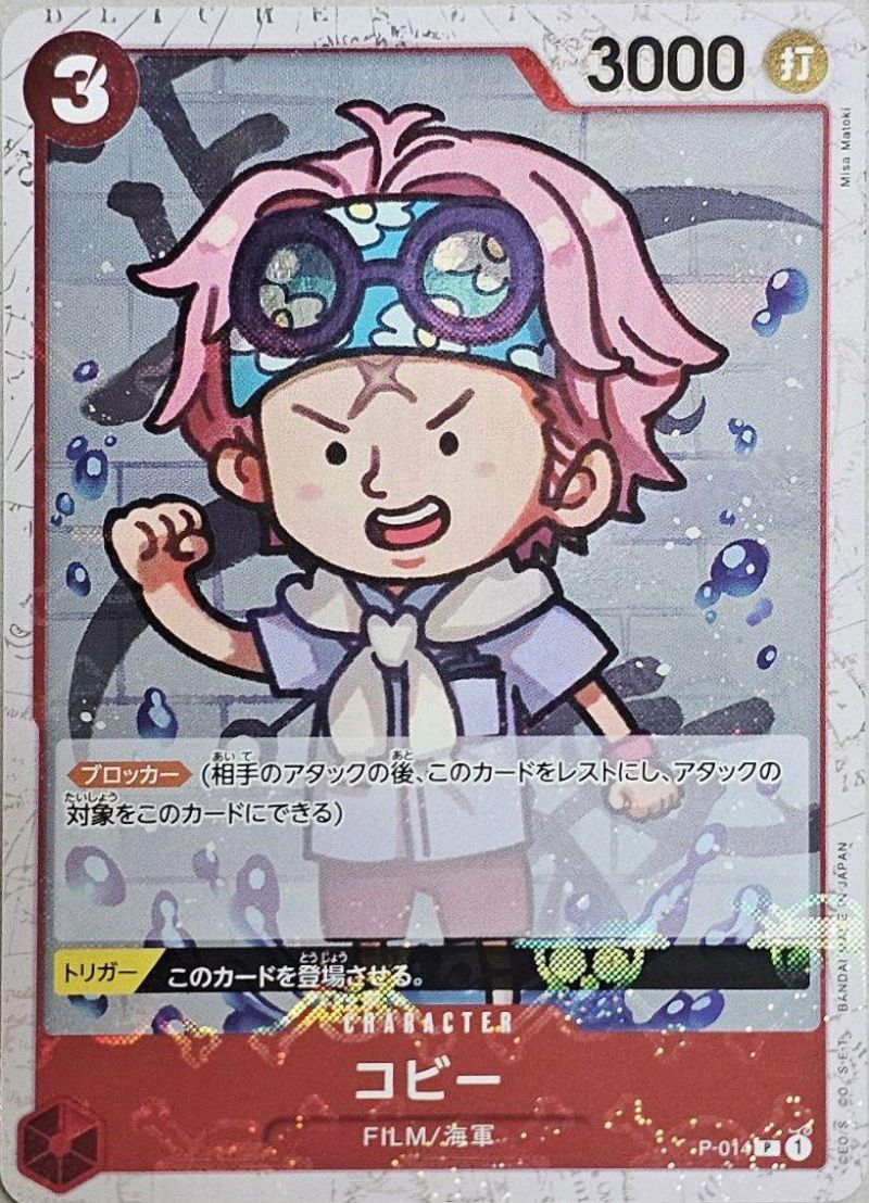 コビー(海賊旗フォイル)(P-014)[P]海賊旗フォイル仕様のコビーは、ONE PIECEカードゲームのプロモカードです。キャラクターイラストが通常版とは異なり、フォイル加工で美麗に仕上げられ、コレクターやプレイヤーにとって貴重な一枚です。コビーは「海軍」の代表的キャラクターであり、デッキ内でのサポート役としての活躍が期待されます。