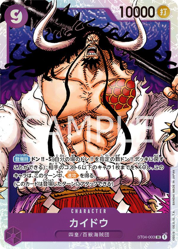 他の画像を見る 販売価格 ¥ 80 〜 ¥ 160 税込 販売価格 ¥ 税込 状態A 状態B 状態C 状態D カイドウ(スタンダードバトルパックVol.5)(ST04-003)[SR] 商品詳細を見る お気に入りに登録する