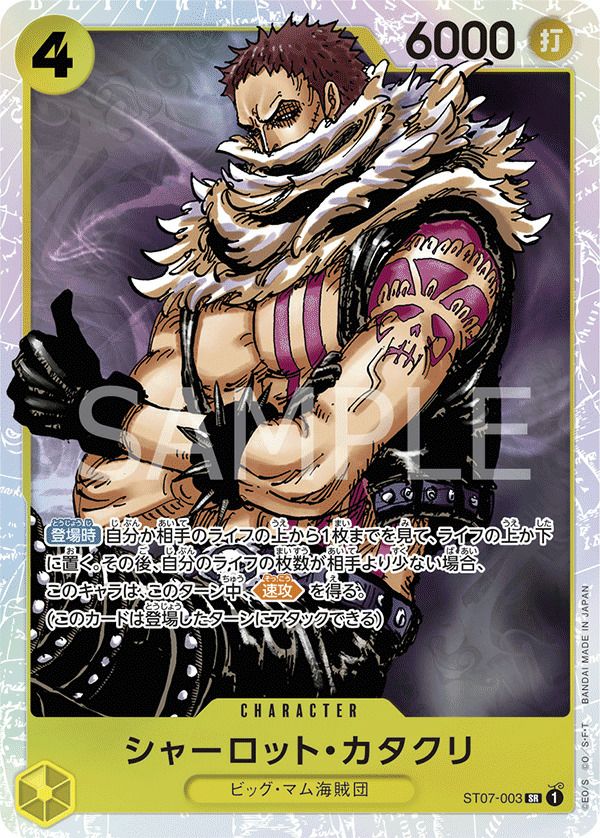 シャーロット・カタクリ(ST07-003)[SR]は、「ビッグ・マム海賊団」デッキに欠かせない重要なカードです。コスト5で登場し、パワー7000、カウンター1000を持つ強力なキャラクターです。主に、相手キャラの攻撃を防ぐ役割を担い、手札からのプレイで自身の戦力を強化する能力を持っています。イラストは、カタクリの冷徹かつ凛々しい姿が描かれており、そのデザインがカードの魅力を引き立てています。
